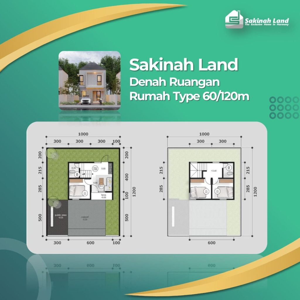 Denah dan Tampak bangunan Rumah Dua Lantai Tipe 60 dengan Luas Tanah 120